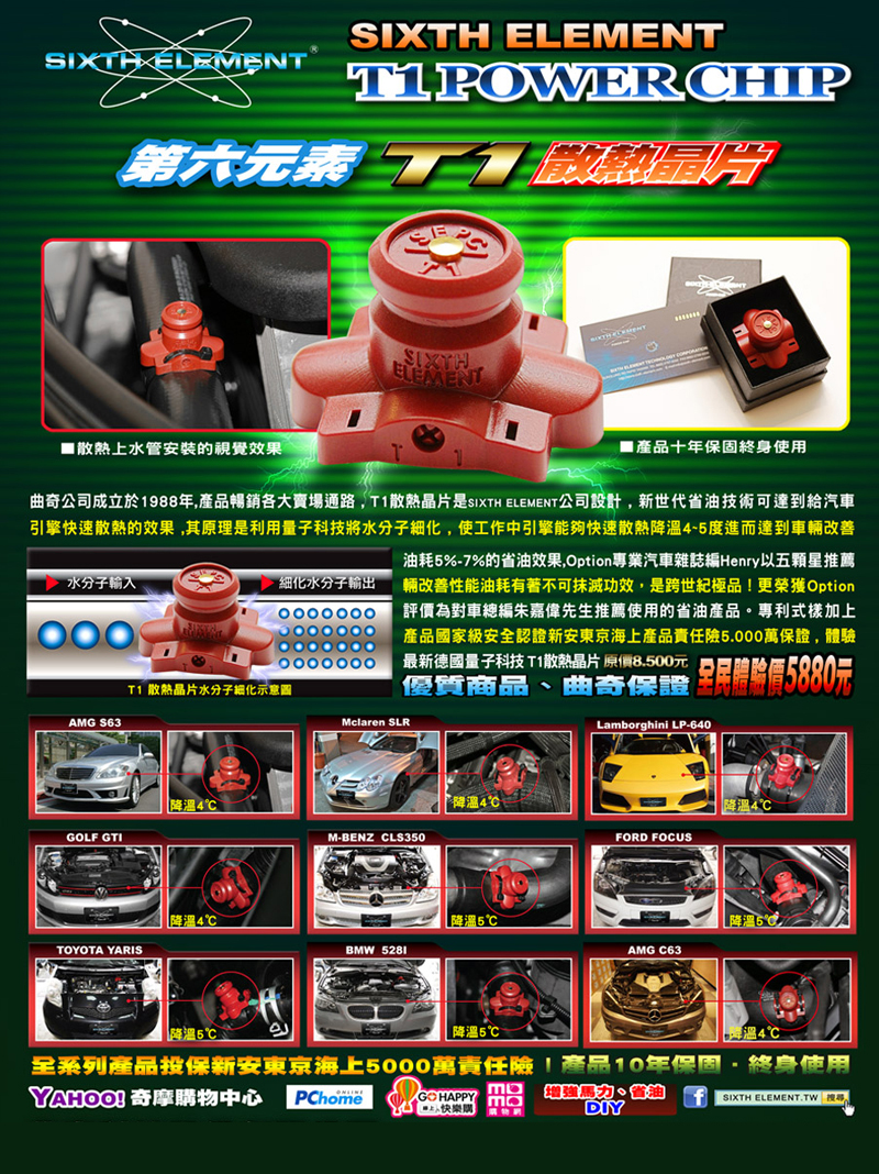 ‧T1動力晶片安裝於散熱上水管細化水分子可以降低水溫4-5度加強引擎散熱效果
