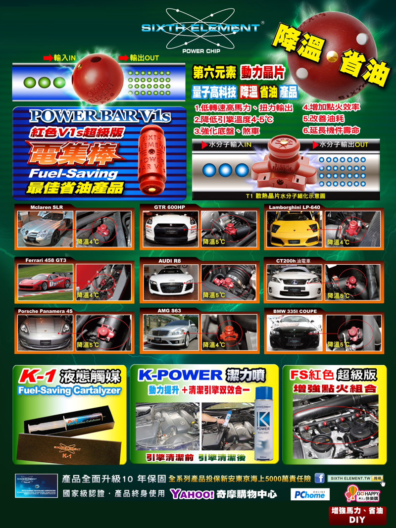 可改善油耗穩定在15%,支援所有車款,動力晶片支援除了電瓶正負極(雙迴路)、冷氣管路、與散熱的管線外,外加支援供油和進氣系統。達到使汽車引擎輕載快速降溫、省油、提昇馬力等多重效果。